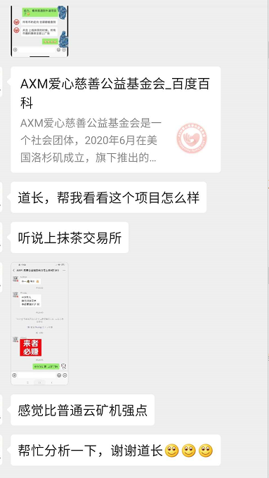 当然,咨询的人也知道是云矿机,只是这个AXM打着要上线抹茶交易所的旗号,所以他就觉得比其他云矿机项目“强点”。