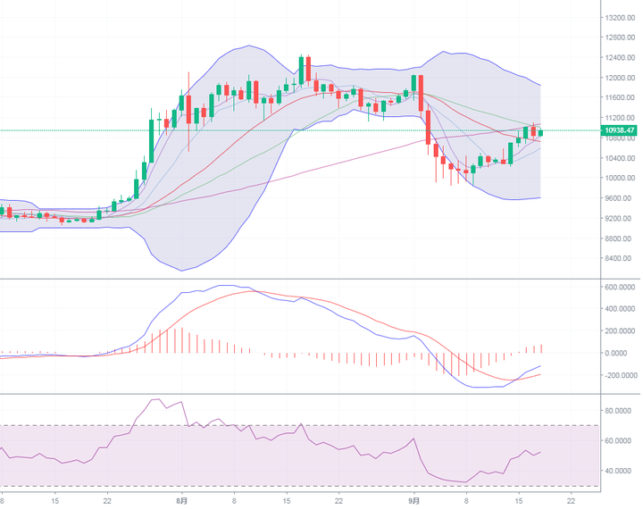 技术面来看,目前小时图与四小时图布林带处于走平,日线MA60均线明显形成短期的压制,而日线布林中轨和MA5均线形成短期的支撑,MA5均线也是这几日的支撑位,目前支撑逐渐上移,MA5均线拐头向上,从这些指标来看,个人认为后市还有上行的空间,不过由于短期MA60均线附近的压制较强,一时无法突破,形成震荡行情,一旦这个压制破位,至少还能再涨三五百个点,所以在这个压制破位以前,个人认为先以震荡行情对待。那么短期的话,上方关注四小时布林上轨11000-11030附近的压制位,防守压制关注日线MA60均线11070附近,下方关注四小时布林中轨和日线MA5均线10850附近的支撑,防守支撑关注四小时图MA30均线10710和布林下轨10680附近,操作上个人建议先以10680-11100这个区间对待,破位再顺势操作即可。