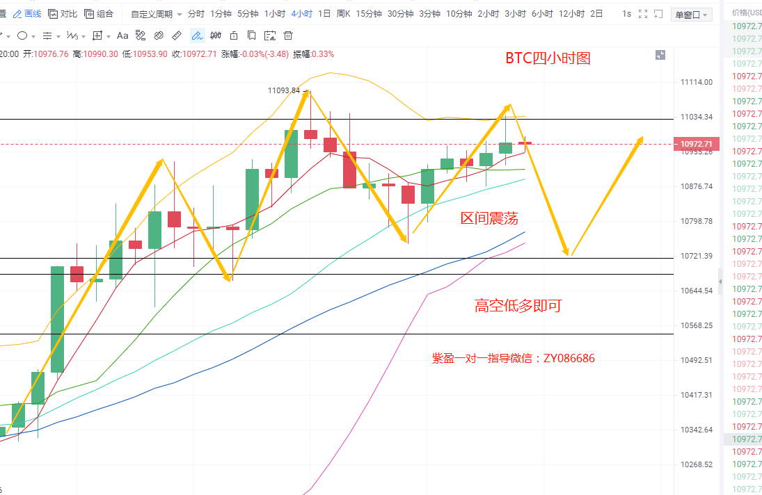 比特币四小时级别来看,布林带通道呈收口状态,币价承压上轨于中上轨之间运行,均线方面:早间收日线后黄金一路上行,比特币跟随补涨5日均线再次上穿10日均线形成金叉,30日均线于下轨上方有强支撑作用,指标方面:MACD快慢线于0轴上方死叉后呈相对平行运行,空头柱仍保持放量,KDJ三线抬头发散,RSI触及超买区后向下试探,综合来看短期还是会跟随黄金走势运行,目前黄金保持下行,晚间短线跟着黄金买就完了,随时关注黄金动向,上方阻力11030,下方支撑中轨10880附近。晚间高空为主低多为辅,上下破位顺势跟进即可。