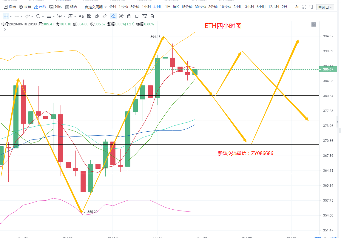 以太坊四小时级别来看,今日凌晨冲高来到了394一线开始回落,早间收日线后,币价开始一路下行,当前报价386.3,布林带通道呈开口状态,币价于中上轨之间运行,均线方面:5日均线拐头向下压制币价,10日均线上扬,30日均线短期支撑作用保持上行,指标方面:MACD快慢线保持金叉向下运行,多头柱逐渐缩量,KDJ三线向下发散,RSI于60下方向上移动,综合来看,白盘整个回落下行走势,晚间大涨大跌行情概率不大,小幅反弹是必然,很大概率维持在380-390之间来回震荡,阻力在395,支撑375,此区间高空低多操作即可。上下破位顺势跟进。