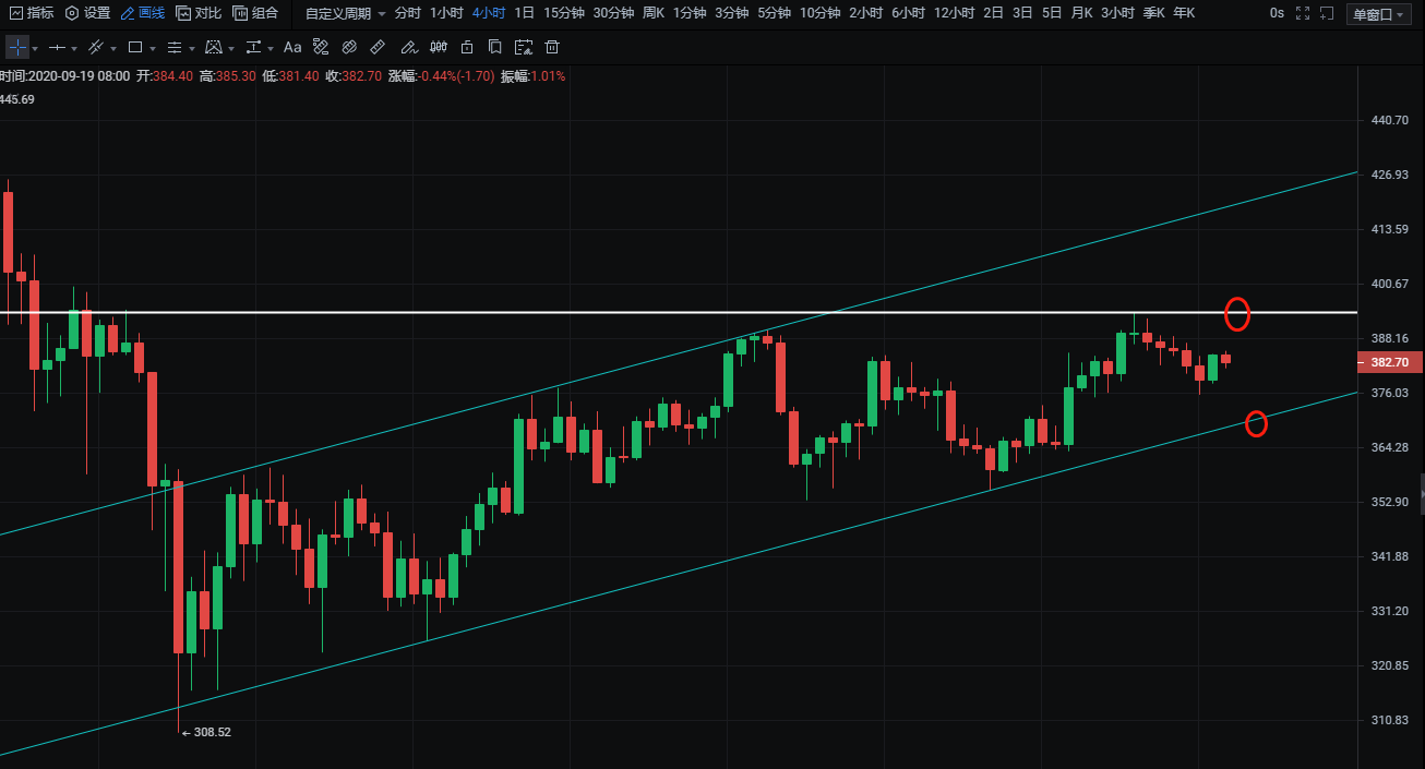 以太坊四小时级别来看价格昨日联动比特币小幅回落至375附近反弹,目前多头力量有所消弱。价格保持上行通道运行,5日均线下穿10日均线运行。幅图指标MACD于0轴上有死叉迹象。KDJ指标三线向下散发,RSI指标三线拐头向下运行。上方压力位420-400-395,下方支撑位370-375。操作高抛低吸。