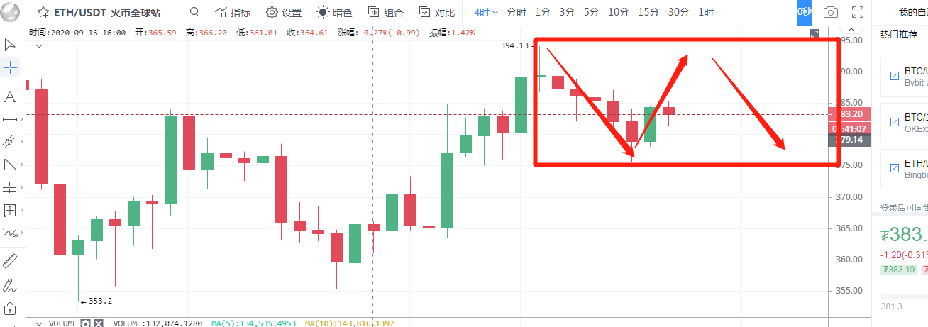 从四小时图看,昨日凌晨币价冲击高点394.13一线后受阻回落于布林带中轨375一线触底反弹,目前运行在383一线附近。布林带张口运行,MACD双线粘合在零轴上方运行,绿色动能量,弱势减弱,RSI在50上方。综合来看日内行情会走一个区间震荡,上方压力位395,下方支撑位375.操作上高空低多。