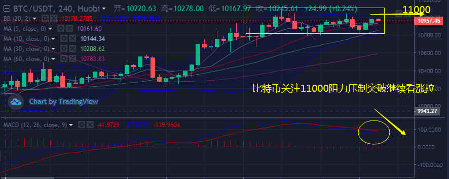 比特币日线上来看K线运行在布林带中轨,布林带小幅缩口上扬,日线上昨天小幅冲高至高点11000一线运行,日线上短期未能企稳日线级别阻力压制11000压制承压下行风险。日线图中,比特币昨日收阳,其K线呈倒T形态,上方的较长上影线足以说明行情在上行时所受到的较强压制关注公众号“韩币钰”,使得币价在其下方震荡多时,都没有迎来好的涨势;而当前上方30日均线呈下行姿态,不断的对其下方的比特币价格施压,使其不进则退;所以这样一来会加速发酵,若能企稳则好,企不稳则要做好回调的准备,不过从附图中的指标来看,还是颇以震荡。日线暂时陷入区间10700-11000震荡,韩币钰老师个人操作建议高抛低吸。