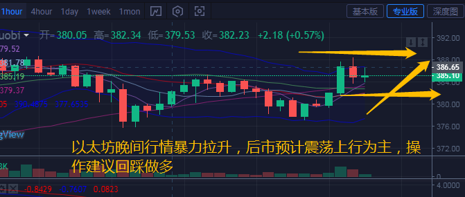 以太坊今日凌晨回踩至375.58,早间行情持续反弹至385附近后回踩,晚间七点左右行情再次暴力拉升十余个点至388.43回踩,目前稳定在384.72附近。