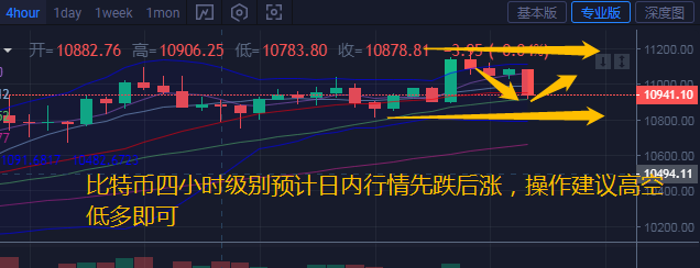 综合来看,短期来看币价处在回踩趋势当中,日内预计行情先跌后涨。关注下方10800附近支撑,上方关注11200阻力压制,日内行情关注10900破位情况。汐柔建议日内操作思路高空低多关注公众号:币汐柔。
