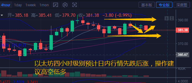 综合来看,早间行情震荡下行为主,日内预计行情先跌后涨。关注下方370-375支撑,上方关注阻力390,日内重点关注380的突破情况,操作建议高空低多关注公众号:币汐柔。