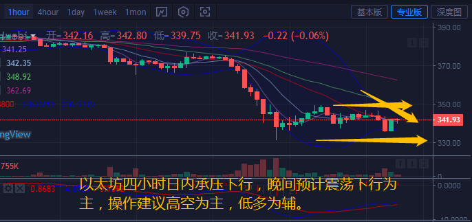 从四小时图上看,布林带张口向下运行,币价击穿下轨后再次回到布林带通道内运行,各均线呈空头排列运行。MA5下穿MA10死叉向下运行,附图中MACD快慢线向下拐头运行在零轴下方。KDJ三线拐头向上在32水平线附近。从小时图上看,布林带缩口运行,目前币价反弹至中轨附近运行。各均线粘合运行在中轨附近。短期看币价仍承压于350位置附近压制,晚间重点关注350是否能突破。
