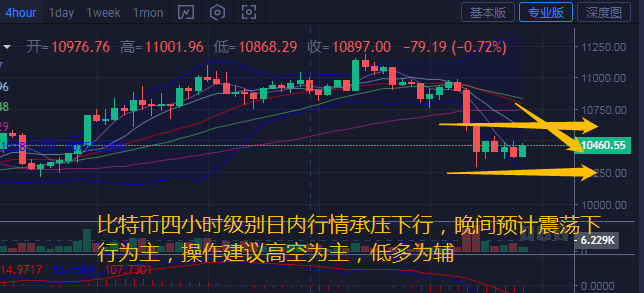 从四小时图上看,布林带张口向下运行,币价击穿下轨后再次回到通道内运行,各均线拐头向下运行。MA5下穿MA10均线呈死叉运行,附图中MACD快慢线呈死叉运行在零轴下方。KDJ三线拐头向上在37水平线附近。从小时图上看,布林带缩口运行,目前币价反弹至中轨附近运行。各均线粘合运行在中轨附近。短期看币价仍承压于10500位置附近压制,晚间重点关注10500是否能突破。