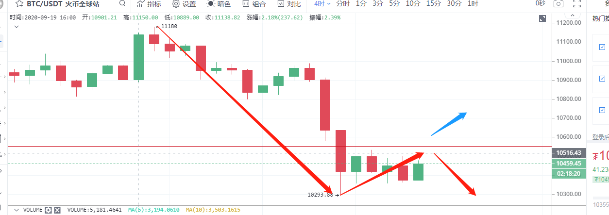 从小时图看,比特币布林带逐渐缩口,币价白盘下行至布林带下轨后触底反弹,现以重回布林带中轨附近。币价上方承压布林带上轨压制呈下行风险。各均线呈空头排列。短期行情虽有所回暖,但上方布林带上方一线压制。大趋势彤欣还是看跌,操作上反弹做空,多单的话企稳10550一线在考虑多单入场。