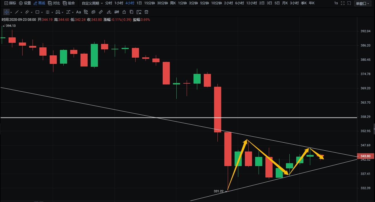 以太坊四小时级别来看价格下跌后处于三角收敛震荡,日内关注区间破位,目前各均线依旧呈空头排列,5日均线上穿10日均线。价格于布林带下轨上方运行。幅图指标MACD于0轴下方死叉运行。KDJ指标三线粘合走平,RSI指标三线拐头向上运行。上方压力位350-355,下方支撑位335-320。操作高抛低吸。