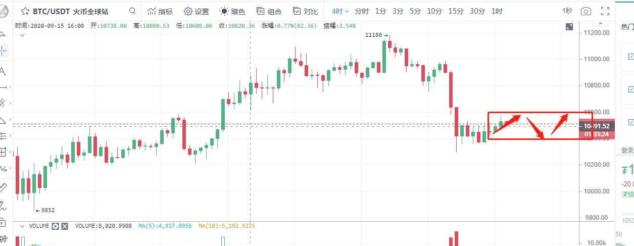 BTC行情分析:昨日比特币震荡上行。从日线上看,昨日比特币收一根小阳线,币价多次试探上方布林带中轨一线,但并未有所突破,随后回撤,说明多头逐渐回暖,有向上反弹的需求,上方短暂压力位10550一线,若币价能企稳这一线,后续币价有机会延续上行向上试探。
