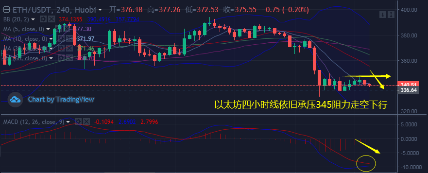 以太坊这波行情冲高至400受阻回落下行,日线上以太坊行情跌势幅度比比特币走势来看快速回落下跌,因为大跌的时候已经超过了10%,这样的情况也说以太坊价位回调要深度一点,因为之前以太的上涨比较爆发,所以就出现了扭曲性,导致大饼下跌时把带动要大。以太坊从日线上分析昨天也是小幅维持区间335-347震荡调整,日线上周一大跌,日线上昨天一根十字星K线,K线运行在布林带中轨,昨天以太坊周一大跌后行情没有出现单边走势,而是维持区间335-347震荡整理,昨天韩币钰老师在操作中给到345-342区间空单两次布局,早晚各一次布局获得在线收益8个点利润。日线上K线运行在布林带中轨下方,布林带张口下行走势。附图MACD在零轴下方死叉运行,绿色动能柱,指标弱势加强。