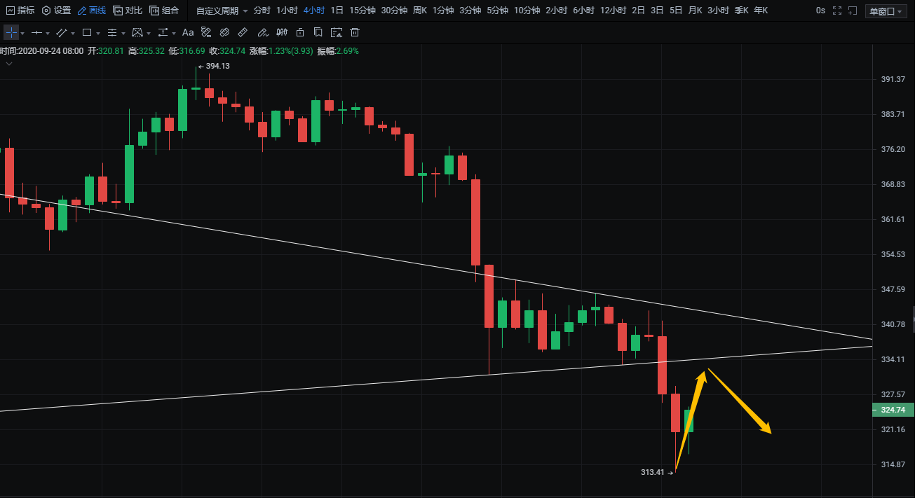 以太坊四小时级别来看价格下跌后处于三角收敛形态下破,日内关注价格反弹力度做空,目前各均线依旧呈空头排列,5日均线下穿10日均线运行。价格于布林带下轨上方运行。幅图指标MACD于0轴下方死叉运行。KDJ指标三线粘合向上,RSI指标三线拐头向上运行。上方压力位330-335,下方支撑位320-313。操作高抛低吸为主。