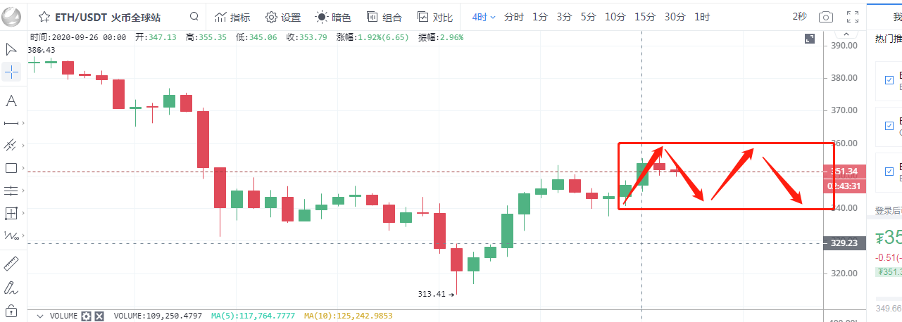 以太坊行情分析:从日线上看,以太坊昨日收取一根小阳线,币价上方承压布林带中轨一线下行风险,币价向上试探360一线阻力开始回落,上方存在强压区域,短期来看,彤欣认为向上突破的可能性不大,但后市多头发力突破360一线压制,那么行情将进一步延续上行。从四小时图看,布林带微微张口,币价运行在中轨上方,行情承压于布林带上轨承压下行,附图MACD金叉向零轴靠拢,绿色动能柱弱势加强。上方压力位360,下方支撑位340.短期来看,彤欣认为还是以震荡区间对待,操作上高空低多。