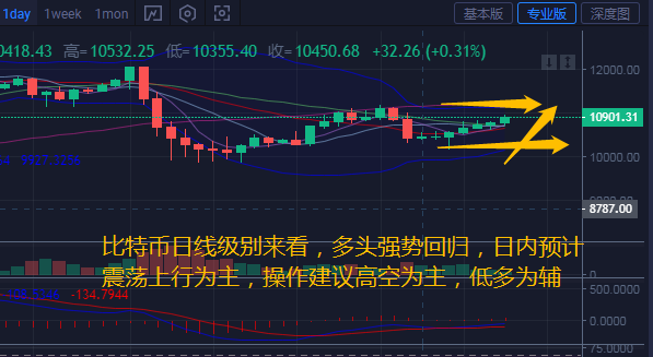 从日线级别来看,K线接连收获六根阳线,币价上行稳定在中轨上方运行,布林带缩口向前运行。MA5上穿MA10向上运行在中上轨区域。附图中MACD快慢线微微向上拐头运行在零轴上方。日线级别来看下方多重支撑,关注下方10700附近支撑,上方关注11000阻力压制,破位继续看涨。
