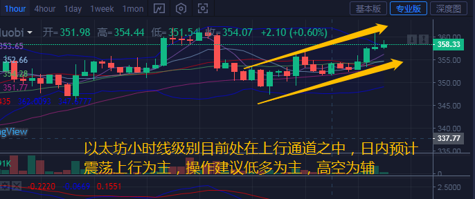 策略一:以太坊350-353附近多单进场,止损3个点,目标360-363