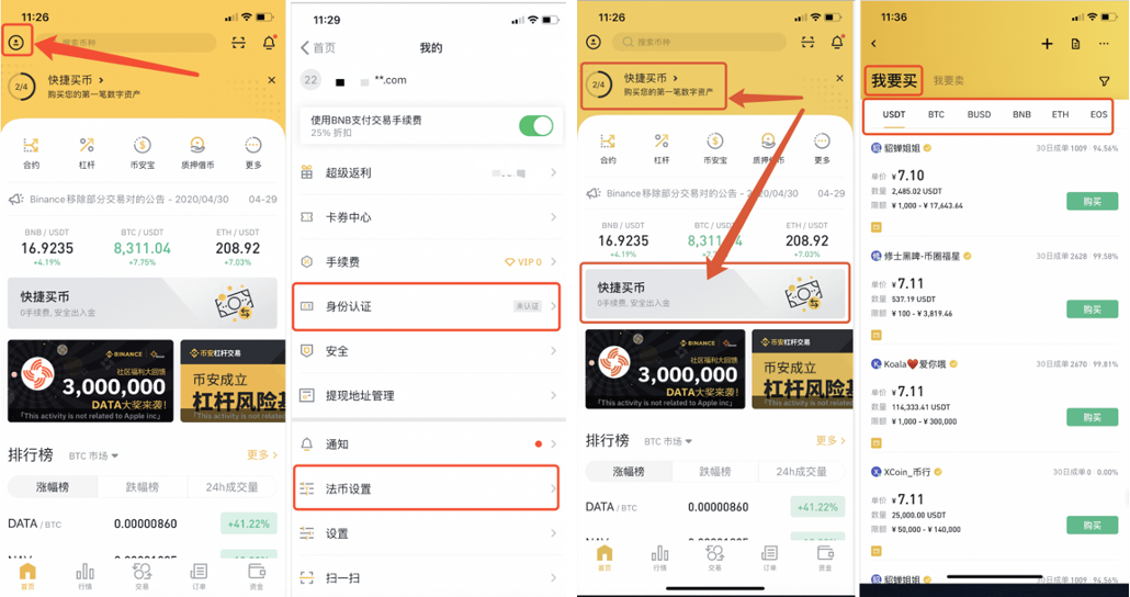 以币安交易所为例,用户登陆之后,需先点击左上角的头像,按要求完成身份认证和法币设置,添加收款方式和绑定手机号。然后返回首页,点击“快捷买币”,选择想要的币种、价格、支付方式,点击商家广告。