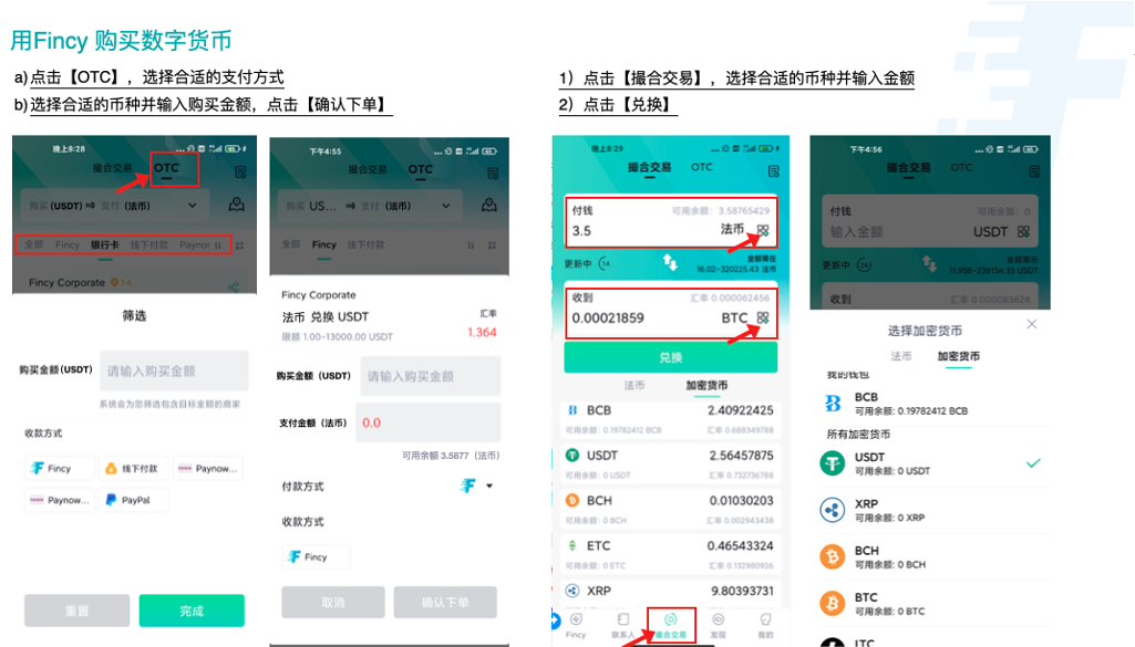 用户登陆之后可以选择先充值法币,法币充值成功之后,用户可以点击底部功能栏里【撮合交易】里的【OTC】,选择想要的币种、价格、支付方式,点击确认完成购买。