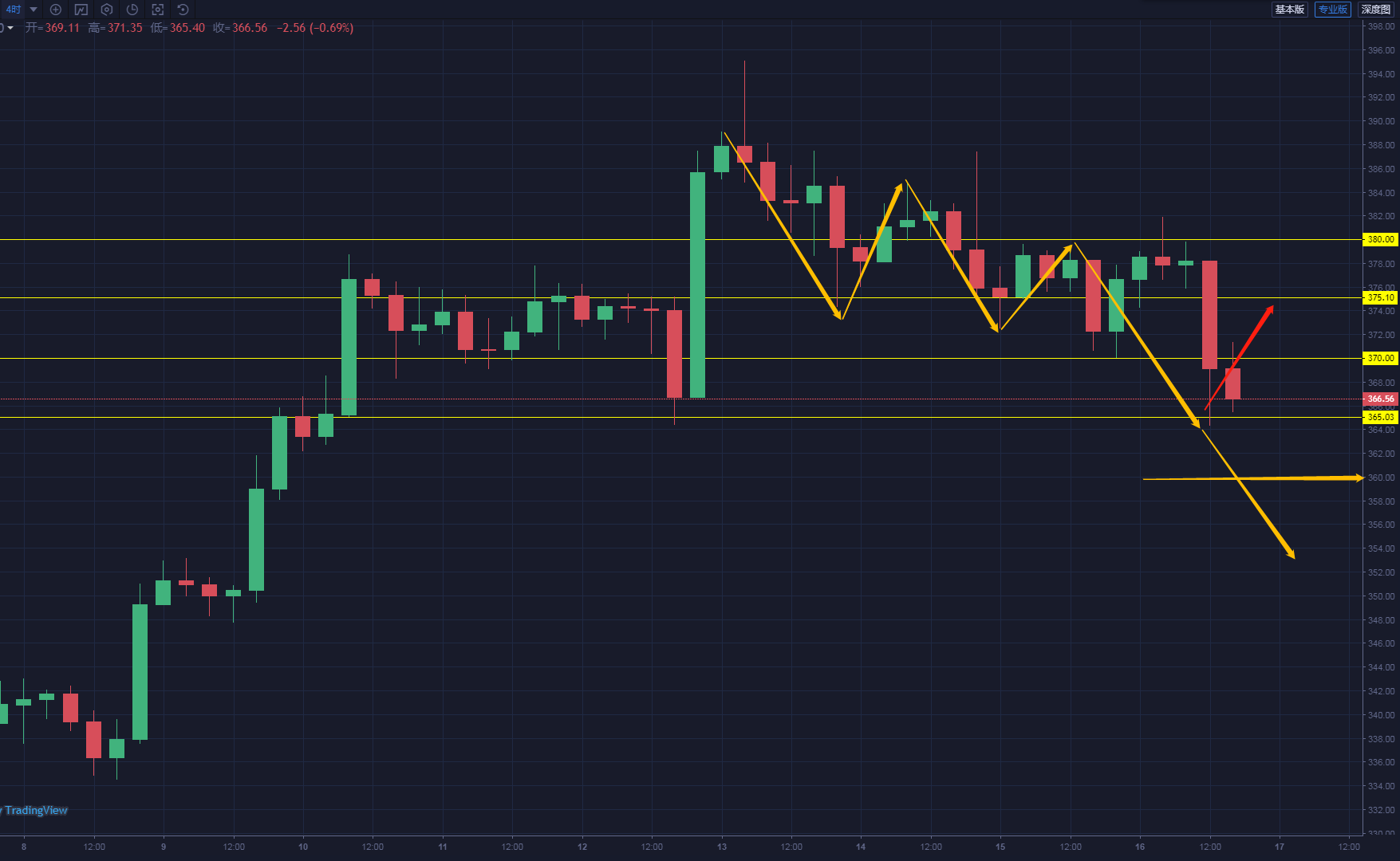 策略二:反弹378-375附近空单进场,止损382,目标370,破位看365