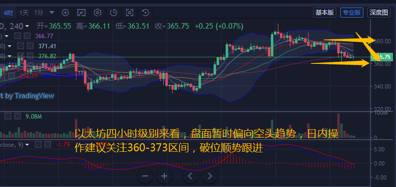 以太坊昨日币价跌幅20余点,从最高点381.54日内一度下跌至361.19位后反弹至365近运行,从四小时级别来看,布林带张口向下运行,币价沿下轨上方运行,重心下移。附图中MACD快慢线向下拐头运行在零轴下方。红色动能柱持续放量。日内关注373-375上方压制,下方支撑360,日内操作建议高空低多即可,破位顺势跟进关注公众号:币汐柔。