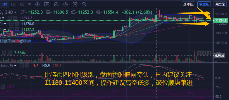 比特币四小时级别来看,布林带平缓向下运行,币价稳定正中下轨区域运行。MA5逐渐走平运行。附图中MACD快慢线向下拐头运行在零轴上方,红色动能柱放量。四小时级别来看盘面依旧保持空头占优,行情处在弱势震荡走势中。汐柔建议日内关注下方11100-11180支撑,上方阻力看11400-11450,操作建议高空低多,破位顺势跟进关注公众号:币汐柔。