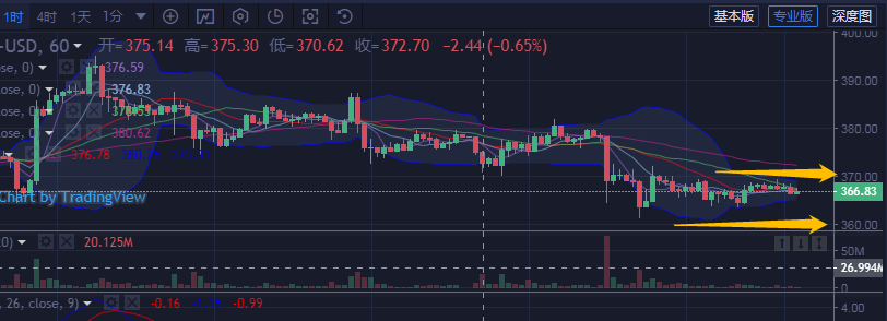 以太坊四小时线来看,以太坊联动比特币走势上偏弱势形态,早间回踩至最低点363.4附近后反弹,午间触及高点369.1附近,目前稳定在366.6附近运行。四小时级别来看,布林带张口向下运行,各均线呈空头排列。附图中MACD快慢线向下拐头运行,红色动能柱持续放量,盘面空头信号较强,日内行情震荡盘整蓄力之后,汐柔预计晚间会有破位行情出现,晚间重点关注区间360-370,破位再考虑顺势跟即可关注公众号:币汐柔。