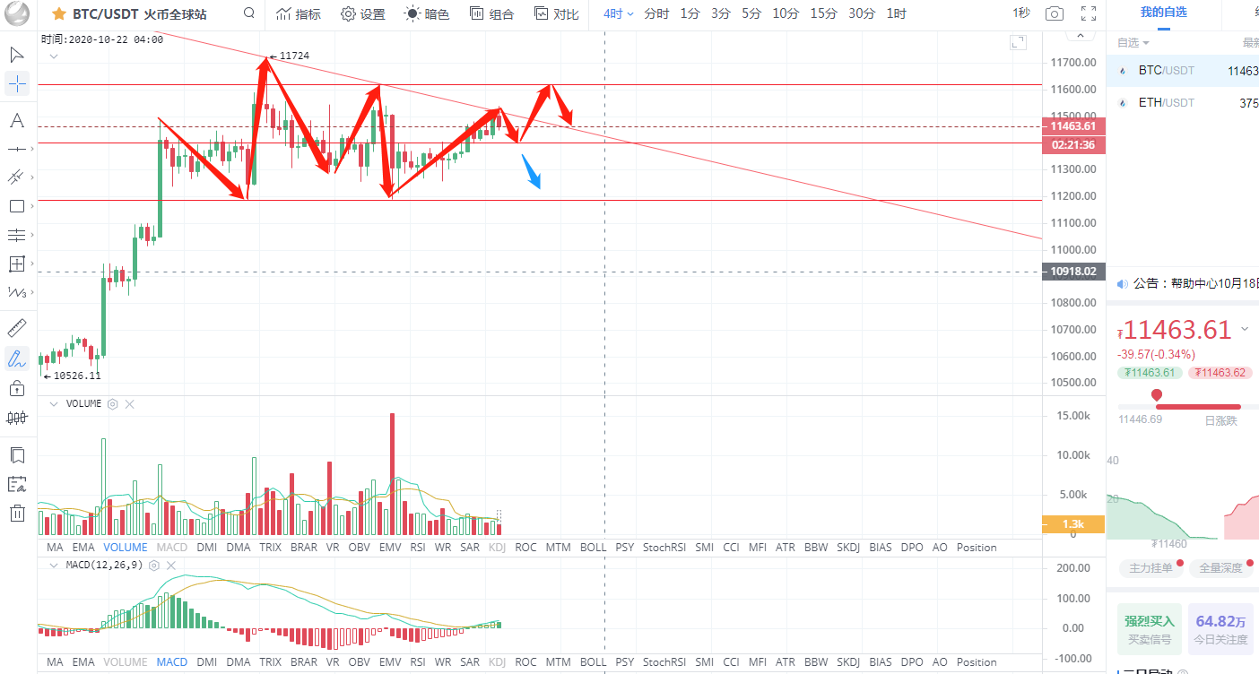 比特币行情分析:比特币早间一波拉升上涨至11538受阻回落,目前运行在11463一线附近。从四小时图看,比特币处于三角区域,早间虚破上方趋势线后承压回调,又回到三角区间内,但从盘面来看,比特币维持震荡上行,多头气息浓重,目前承压回调,待多头恢复,预计行情继续上攻。附图MACD双线金叉在零轴上方运行,绿色动能柱持续放量。上方压力位11620,下方支撑位11400.操作上高空低多。