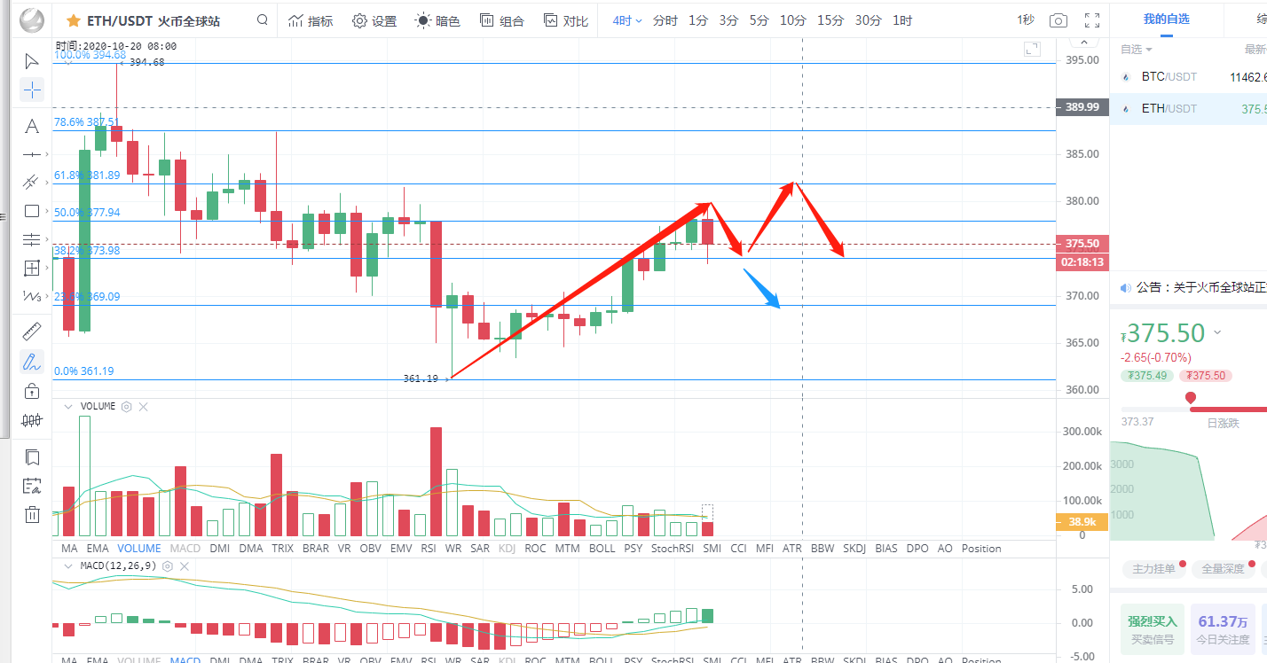 以太坊行情分析:从四小时图看,以太坊随动比特币成功站稳370区间上方,早间触及布林带上轨380一线承压回调,目前以太坊企稳斐波那契0.382一线,布林带缩口,5日均线上穿10日均线金叉向上发散,附图MACD双线金叉在零轴附近运行,绿色动能柱持续放量。上方压力位382,下方支撑位371,综合来看,目前趋势偏向多头,操作上回踩做多为主,高空为辅。