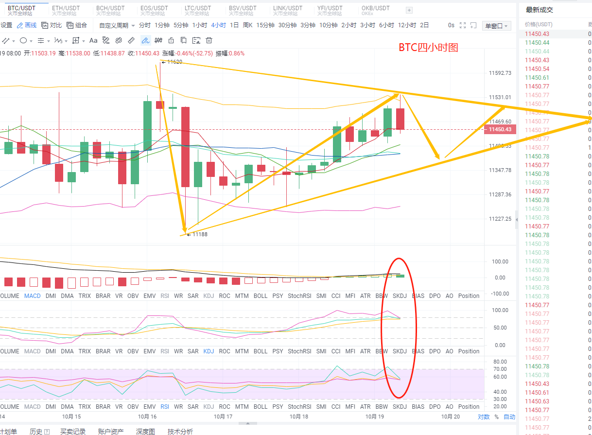早间冲高11538一线,空单触发空单策略,币价冲高后快速回落至11440附近,目前来看四小时级别,布林带通道呈收口向下,币价受5日均线支撑于中上轨之间运行,MACD快慢线目前保持金叉,量能柱由虚体转变为实体柱,这说明多头正在减弱,看下方KDJ三线下挫,RSI于超买区向下聚合,综合来看,下方各均线都有支撑效果,但是不影响空头趋势的发展,日内看空多一点,操作还是高空为主吧。低多的话关注可以在中轨附近埋伏,最好不要挂单哦,把握不好可以联系紫盈