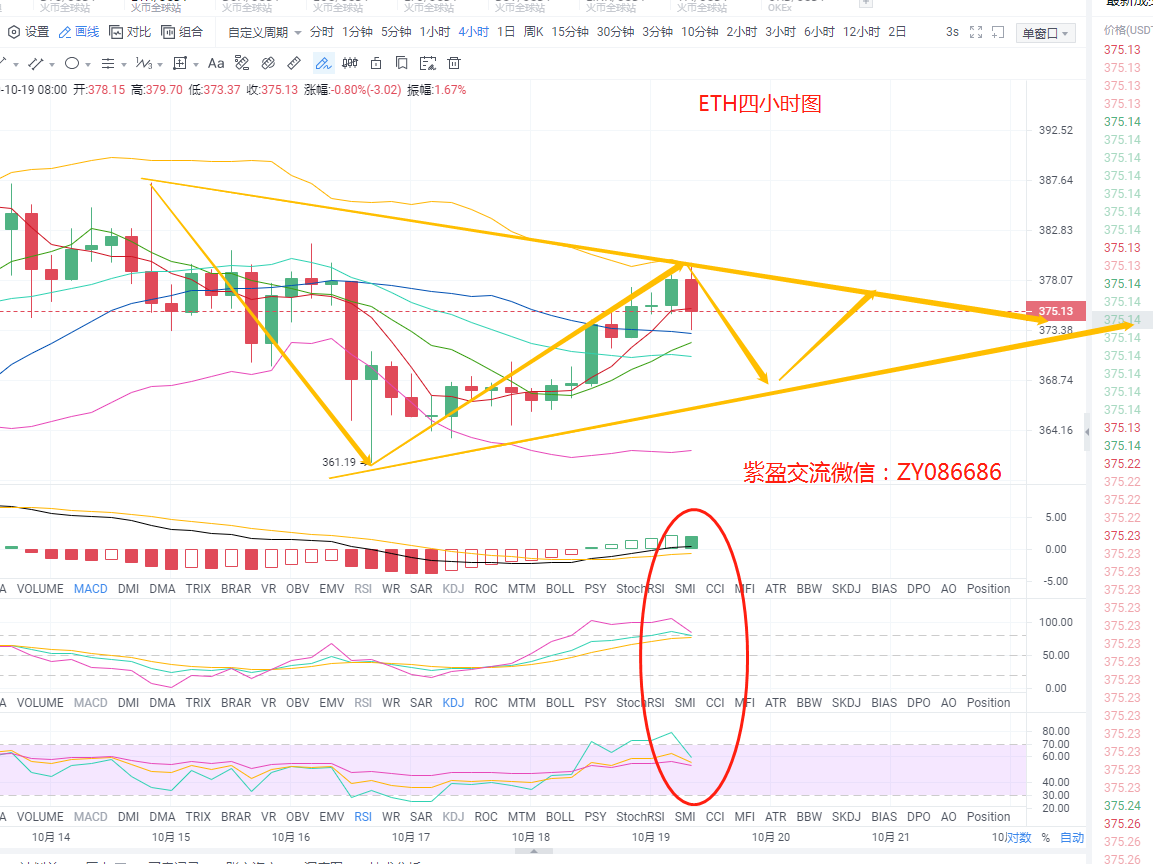 以太坊四小时级别,早间冲高触及上轨后回落,币价回落至30日均线附近反弹,目前维持在375附近,布林带通道呈收口状态,指标与比特币相似,多头正在减弱,均线有支撑,日内看空较多,操作高空为主,以太坊整体来看,就像比较激进的投资者,涨的时候涨的厉害,跌得时候跌得厉害,短线合约是很好的选择,上方阻力380,378附近可以空。