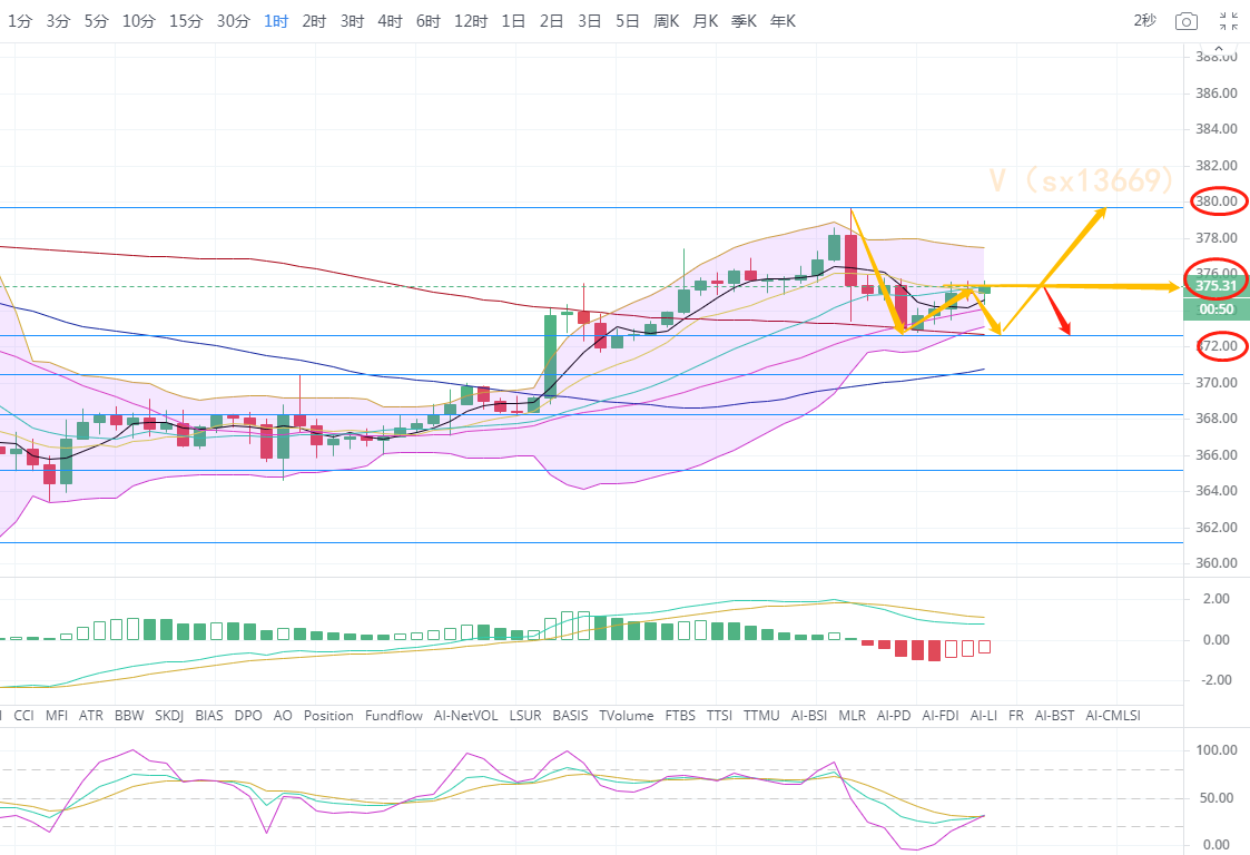 策略一:回踩371-373附近多单进场,止损368,目标378,破位继续上看380