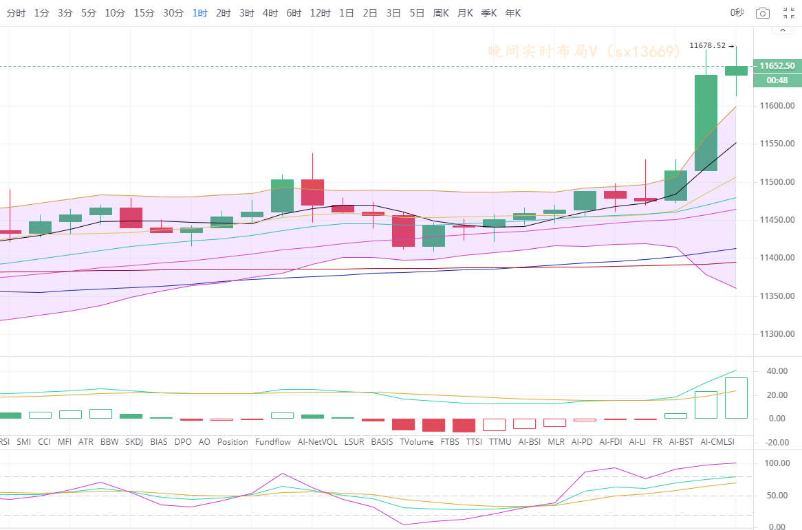 看短周期,比特币刷新高点走出一波强势上涨,目前走出前期压制位置11620一线,四小时图布林带呈向上开口,各均线保持上攻姿态,行情上探打破布林带上轨压制,价格来到上方区域,后续若是在12点收线价格能够企稳11620位置,晚间行情大概率还会上攻 公众号:诗萱言币。但是目前诗萱认为这波短期上拉,后续供给不足,不建议各位币友盲目追多,先仍是以回调为主,下方支撑关注11500一线,上方压制关注前期反转点位11720附近。
