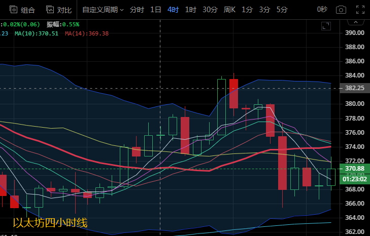 以太坊昨日行情走出了自己的路线,并没有跟随比特币走震荡上行,晚间行情以太坊大幅度回踩,下行至最低点365.4后小幅度反弹,今日行情走势依旧弱势。四小时级别来看,布林带平缓向前运行,币价昨日一根大阴线跌破中轨支撑,目前稳定在中下轨区域运行,各均线纷纷向下拐头,附图中MACD快慢线呈死叉趋势向下运行,红色动能柱放量,汐柔建议以太坊日内关注下方支撑365,上方阻力关注375-380附近,操作上建议高空低多即可关注公众号:币汐柔。