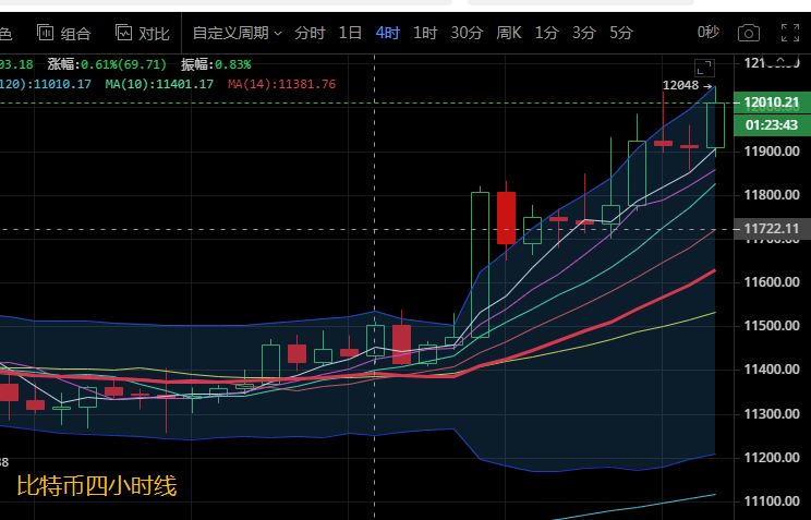比特币昨日凌晨行情震荡下行,最低点触及11650后,日内持续震荡上行,今日凌晨继续拉升,打破上方12000压制,最高点触及12035后小幅回落,目前稳定在11989附近运行。