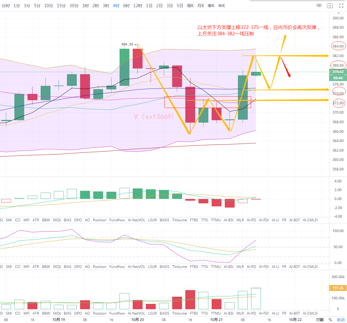 比特币现价380美金,昨日比特币大涨并没有带动起价格的拉升,白盘维持区间震荡于下午迎来一波回撤,反而再次下行走低至365一线,昨日给出的以太坊多单策略也是成功出局。早间下方探底368四小时线收阳十字星,多头发力于8点开始拉伸补涨,午后再次回到382一线,但上方压缩币价收倒锤线,空头主力压制价格再次回调379附近。(V:sx13669 公众号:诗萱言币)