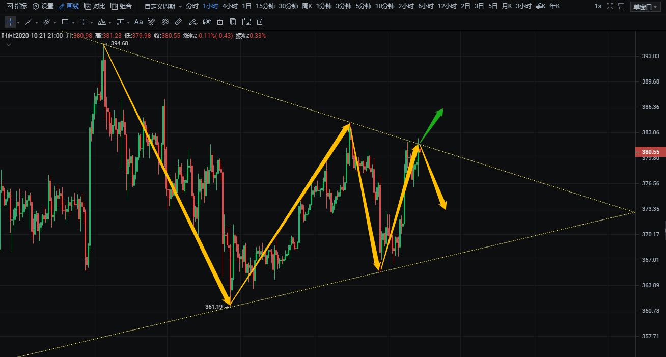 以太坊小时级别来看价格于三角区域上轨附近承压运行,目前有破位迹象。布林带呈张口运行,各均线呈多头排列,幅图指标MACD于0轴上方金叉运行,KDJ指标三线粘合运行,RSI指标三线拐头向上。盘面趋势多头迎来反扑,晚间操作低吸为主,下方支撑位372,上方压力位390-385。