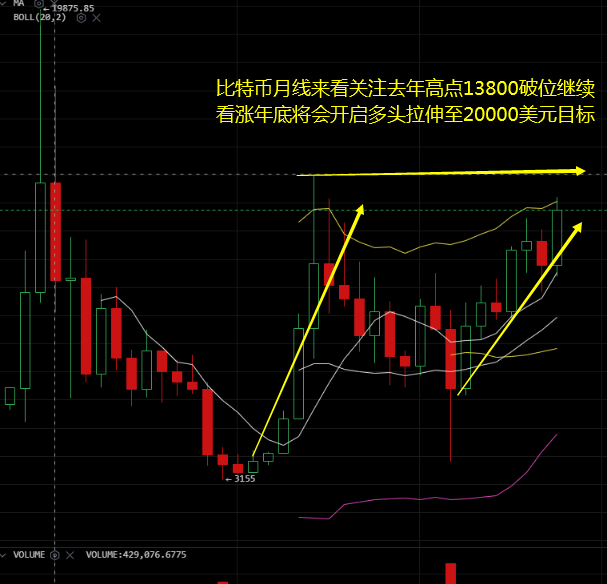 比特币月线上分析今年三月份行情大幅度下挫至3700低点后,月线在三月底获得支撑快速拉升上涨,月线上分析K线震荡上行走势,布林带缩口上扬,连续从三月份开始行情开启多头,月线上基本上每月在升高。