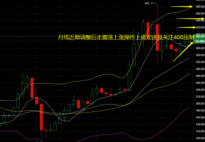 四小时线成头肩顶状态很多分析师预测行情会回落下行破位390支撑,四小时线目前在韩老师写行情的时候K线运行在布林带中轨,布林带缩口上扬,下方获得五日均线下方390不破晚间操作上韩老师个人还是建议做反弹多单看涨,毕竟比特币已经涨破高点压制,只是近期以太坊行情有点懈怠。不破390的话,肯定后市以太坊多头还是有反弹上攻走势。