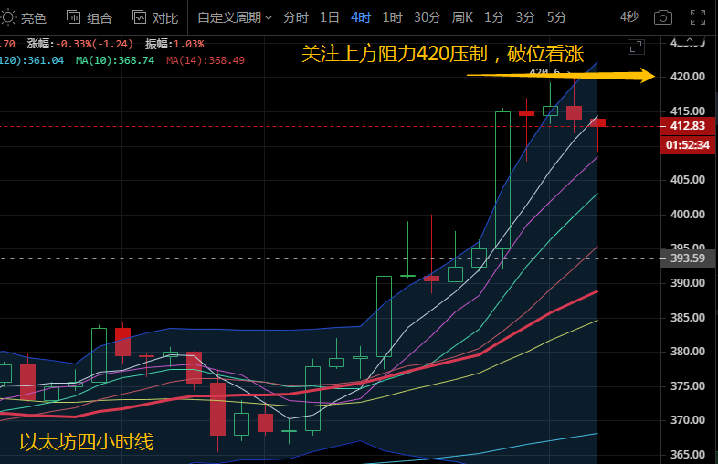 以太坊昨日晚间多头动能充足,行情不断向上试探突破新高,今日早间行情突破420压制至420.6,目前回落稳定在412附近。以太坊四小时级别来看,行情向上插针触及高点420.6后迅速回落。布林带张口向前运行,各均线拐头向上运行,附图中MACD快慢线金叉向上运行在零轴上方,绿色动能柱持续放量。四小时级别,盘面多头趋势不变,汐柔建议日内重点关注400-420区间,操作建议低多为主,高空为辅关注。