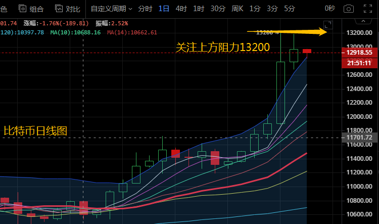 比特币昨日行情震荡上行趋势,晚间行情多次上行试探上方阻力,今日凌晨币价上行至最高点13185.95后受阻回落,目前稳定在12919附近运行。
