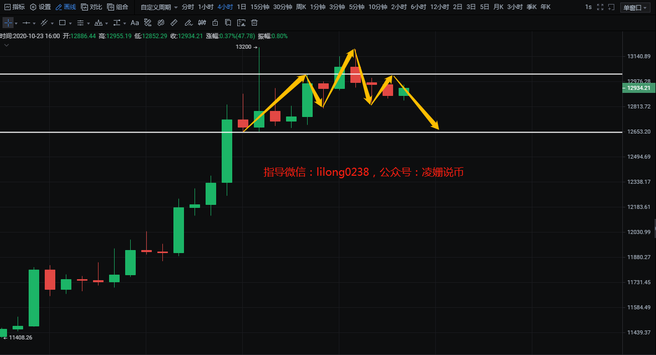 比特币四小时级别来看价格凌晨拉升至13185美金回落有头肩顶迹象,左肩高度为13020美金,右肩最高至12999美金。目前行情保持高位震荡,布林带呈张口向上运行,价格于中轨上方运行。10日均线有破位迹象。幅图指标MACD于0轴上方有死叉迹象,KDJ指标三线向下发散运行,RSI指标三线拐头向上,EMV指标下穿运行。上方压力位13020,支撑位12650,操作上高抛低吸为主。
