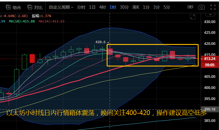 以太坊早间在上行触及高点420.6后,多头动能放缓,日内维持在415一线上下波动,目前币价稳定在414。以太坊小时线来看,布林带平缓向前运行,币价回踩至中下轨区域运行,各均线粘合在中轨下方。附图中MACD快慢线向下拐头运行,红色动能柱放量,RSI三线向前走平。晚间汐柔建议操作注意回调,关注400-420区间,操作建议高空低多即可。