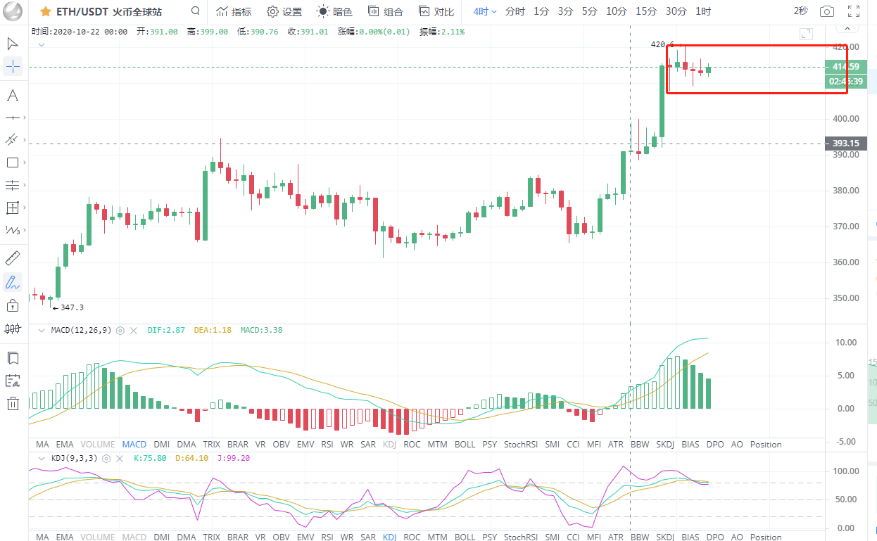 以太坊行情分析:以太坊昨日收取一根大阳线,直破布林带上轨,今日凌晨最高触及420.6一线后承压回落,从目前的情况来看,以太坊又开始跟随比特币走势同进同退了。日线上布林带开口向上,k线运行在布林带上轨上方,5日均线上穿10日均线呈上攻之态。附图中MACD双线金叉向上,绿色动能柱持续放量,KDJ三线金叉向上运行。就日级别线上看,以太坊回归正轨,整体的趋势偏向多头。
