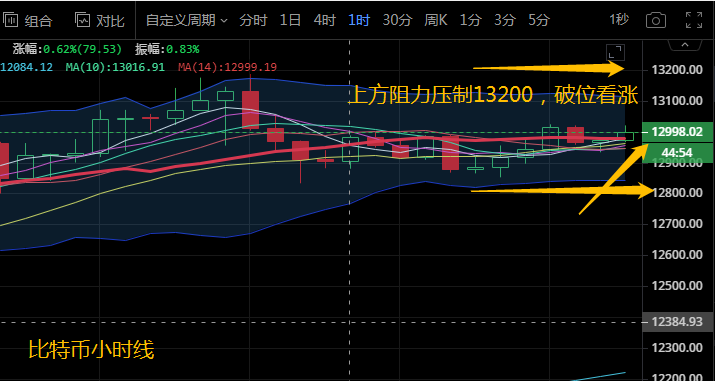 比特币小时线级别来看,布林带平缓向前运行,行情稳定在中轨附近上下波动,各均线粘合运行在中轨下方。附图中MACD快慢线向下运行在零轴上方,红色动能柱放量。小时线级别来看,币价目前持续震荡上行。晚间操作汐柔建议关注上方阻力13200,下方12800支撑,操作建议低多为主,高空为辅即可。