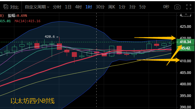 策略二:反弹418-415附近空单进场,止损3个点,目标410-408,破位看405-400