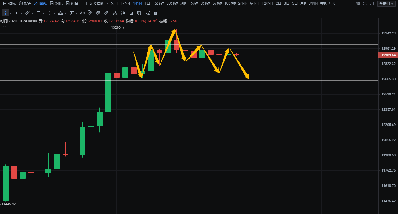 比特币四小时级昨日也有提到过头肩顶迹象,左肩高度为13024美金,右肩最高至13023美金。目前行情保持高位震荡,布林带呈张口向上运行,价格于中轨上方运行。14线昨晚插针式破位拉回。幅图指标MACD于0轴上方高位死叉运行,KDJ指标三线向下发散运行,RSI指标三线拐头向下,EMV指标下穿运行。今日盘面多头量能逐渐缩减,谨防行情跳水。上方压力位13020,支撑位12650,操作上高抛低吸为主。