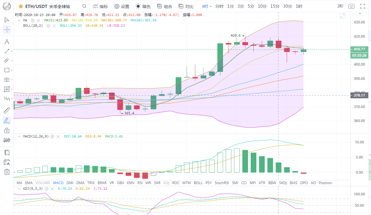 比特币行情分析:从日线上看,昨日收取一根十字阴线,今日币价重回布林带中运行,多头趋势逐渐减缓,行情处于修复阶段,日线上布林带张口,各均线多头排列,附图中MACD双线金叉在零轴上方运行,绿色动能柱持续放量,KDJ三线金叉平缓运行。就日级别线上看,大趋势还是偏向多头,但上方不断抛压,谨防价格的大幅下落。