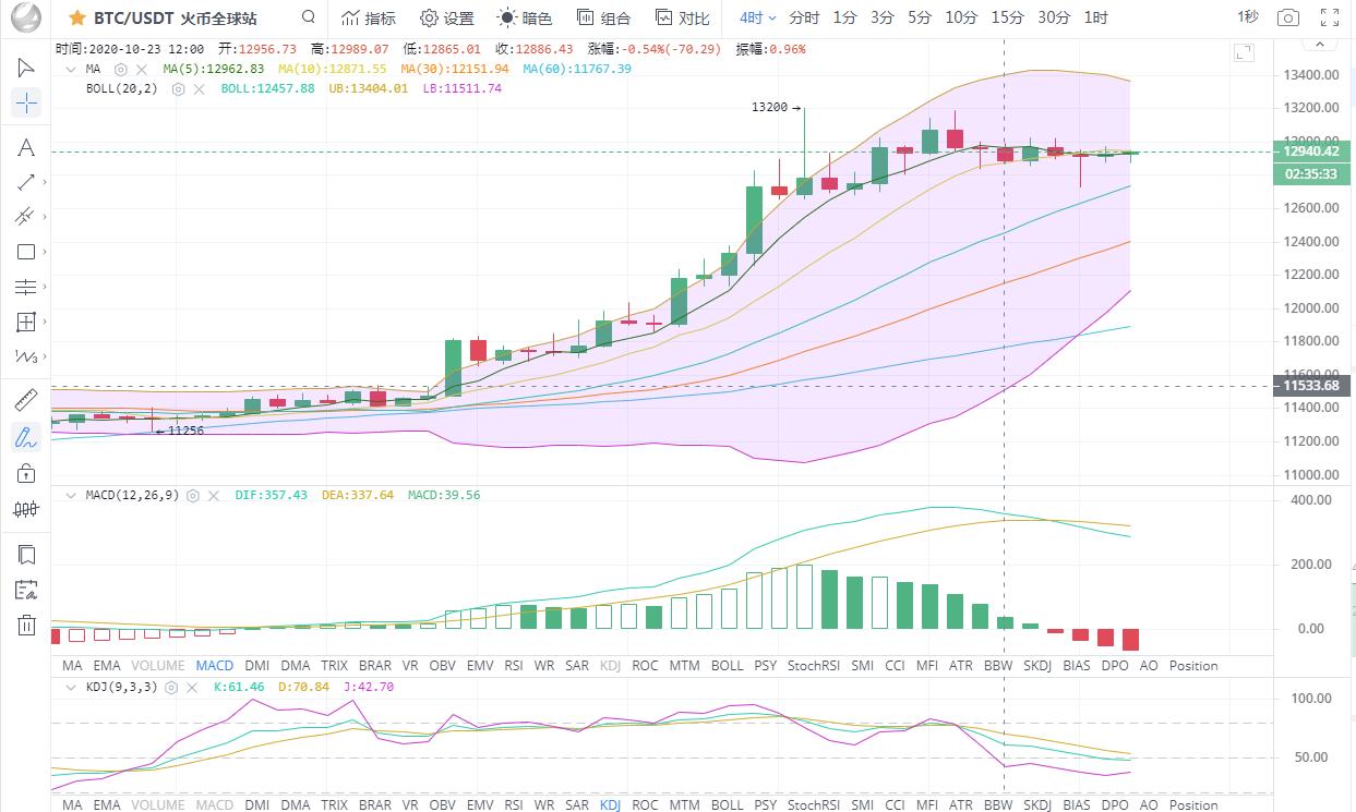 从四小时图看,布林带开始缩口,币价围绕5日均线和10日均线附近运行,走势较为平缓,附图MACD双线死叉在零轴上方运行,红色动能柱弱势加强,KDJ三线死叉开始走平。下方支撑位12750,上方压力位13000.综合来看,日内维持着区间震荡。操作上低位做多,高空做空。