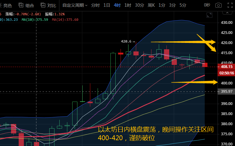 以太坊今日凌晨行情回踩401.63后反弹,日内维持412一线上下震荡。午间拉升至高点414.49后再次回落,目前稳定在409.63。