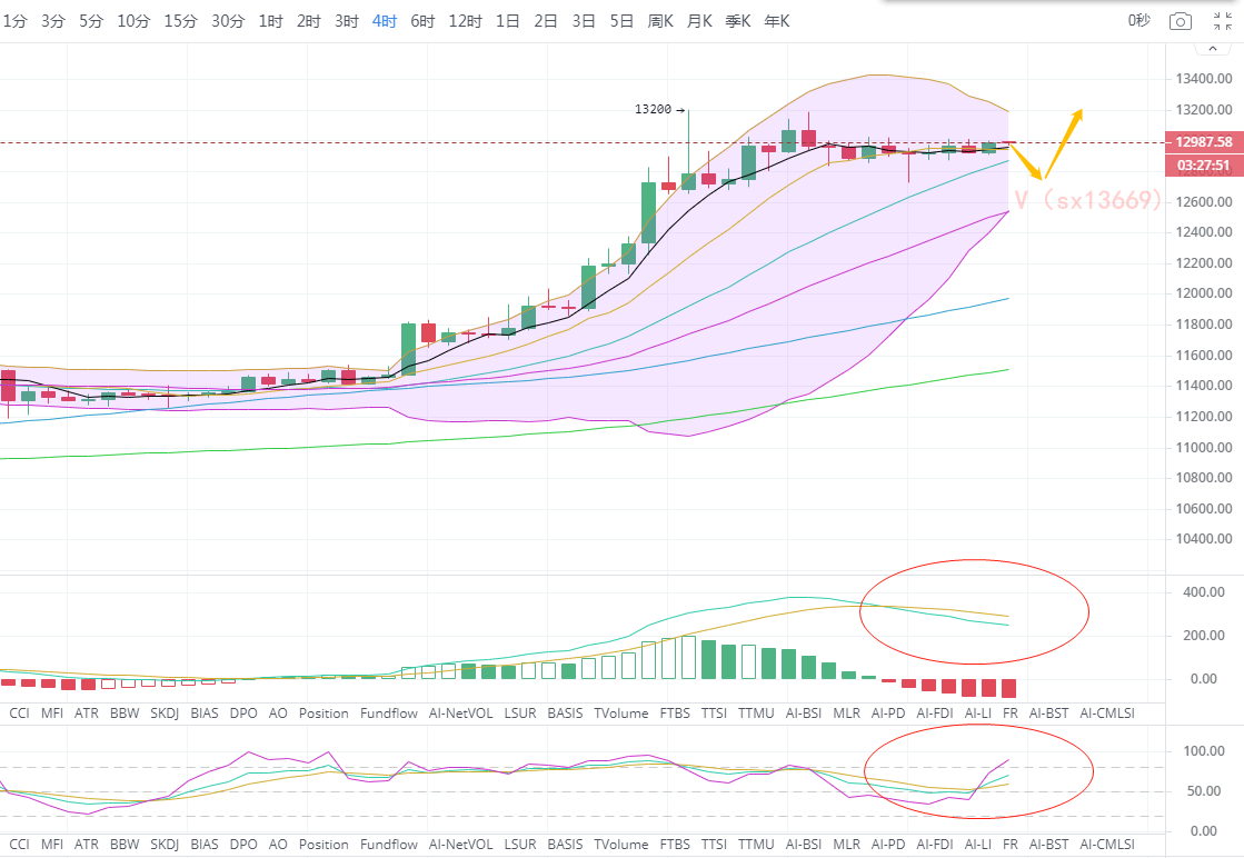 日线K线昨日收阴终止6连阳的多头态势,但说就此价格会应声下跌还为时尚早,日内还是多头占据优势,也得看下周其他金融市场开盘情况。四小时线布林通道开始收缩,K线走平,价格窄幅震荡,多头开始反转,MACD指标空头放量,盘久必生变,短线还是有回调需求。小时线布林通道横盘,各均线缠绕支撑币价上行 公众号诗萱言币,MACD指标开始多头开始放量,KDJ三线向上发散。上方13000-13200压制,下方12650-12800支撑,价格破位12750有再次回落12650的风险,晚间操作思路依旧是高空低多。